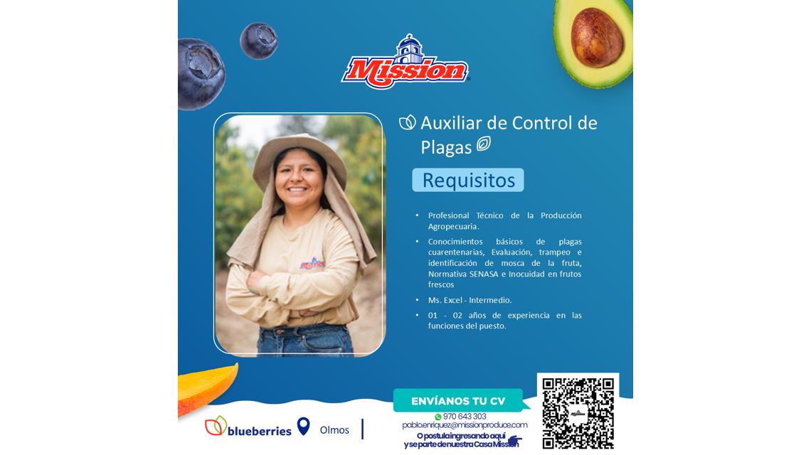 Misión del Puesto: Controlar el sistema de trampas de mosca de la fruta, realizando su instalación y mantenimiento, velando por mantener los parámetros establecidos por SENASA, a fin de cumplir con las regulaciones dadas por esta autoridad y reducir la presencia de plagas en la fruta de cultivo.